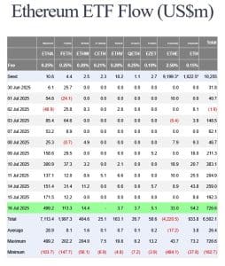 Liderando a movimentação estava o ETF de ETHA da BlackRock, que sozinho representou US$499 milhões das entradas totais. O fundo de FETH da Fidelity veio em seguida, com substanciais US$113 milhões, classificando-se como a segunda maior entrada diária para o fundo. Esses números são da Farside Investors, uma respeitada empresa de análise que monitora os fluxos de fundos de criptomoedas.