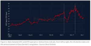 A eleição presidencial nos Estados Unidos provou ser um catalisador para o desempenho recente do Ethereum. A “Revisão de Volatilidade” da Bybit para o mês de novembro mostra que o ETH excedeu em muito o BTC em termos de volatilidade. A relação do preço dos dois títulos também aumentou rapidamente, indicando a crescente demanda por Ethereum.