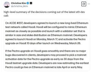 Tim Beiko, um desenvolvedor da Ethereum Foundation, explicou que se o Pectra funcionar sem problemas no Hoodi, a equipe poderia mirar uma data de lançamento da mainnet apenas 30 dias após a ativação da testnet. Isso tornaria a data potencial de lançamento da mainnet para o Pectra em abril de 2025. No entanto, esse cronograma permanece flexível, dependendo dos resultados dos testes no Hoodi.