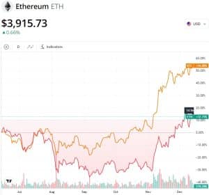 Em 6 de dezembro, o Bitcoin (BTC) fez história ao quebrar a barreira dos US$100.000 pela primeira vez. Mas o Ether não conseguiu compensar e não conseguiu ultrapassar sua barreira psicológica anterior de US$4.000, principalmente após uma conquista bem-sucedida do Bitcoin. Embora essa diferença entre o desempenho do Bitcoin e do Ether apareça, alguns especialistas acham que o Ethereum diminuirá essa lacuna no futuro próximo/de curto prazo, e então pode abrir caminho para o rali recorde do Ethereum em 2025.