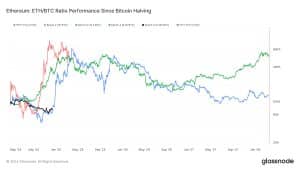 Além dos padrões técnicos, a relação histórica do Ethereum com o ciclo de redução pela metade (halving) do Bitcoin pode fornecer insights adicionais sobre seu desempenho futuro. O analista de criptomoedas Venture Founder observou que, após cada redução pela metade do Bitcoin, o Ethereum normalmente fica atrás do Bitcoin por cerca de oito meses antes de ultrapassá-lo. De acordo com o analista, o mercado está agora 8 meses após a redução pela metade do Bitcoin e deve superar em muito o Bitcoin nos próximos meses, de acordo com dados de mercado.