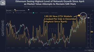 Outro fator significativo do futuro promissor do Ethereum é o aumento ativo do número de novos endereços (ou seja, carteiras) atraindo usuários. De acordo com a plataforma de inteligência de mercado Santiment, mais de 130.000 novos endereços Ethereum são criados em média por dia em dezembro. Isso representa a maior taxa de criação diária de carteiras vista em mais de oito meses, com o último pico desse tipo ocorrendo em abril. A crescente atividade da carteira implica que o interesse do investidor no Ethereum está aumentando e, portanto, o preço do Ethereum vai subir mais.