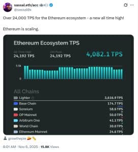Esse aumento na taxa de transferência é o resultado de anos de atualizações no roadmap, especificamente as atualizações Pectra e Dencun, que foram projetadas para reduzir o custo e o atrito de dados para redes de Camada 2. O resultado é o que Ryan Sean Adams, do BANKLESS, descreve como um fator de escalabilidade de 200x para o ecossistema. O “desbloqueio do conhecimento zero” — a maturação das provas de conhecimento zero, da matemática teórica à infraestrutura pronta para produção — está finalmente chegando ao palco principal. Vozes da indústria já estão ajustando suas expectativas, com previsões circulando de que a rede poderá atingir 100.000 transações por segundo nos próximos meses, um número que a colocaria em concorrência direta com processadores de pagamento tradicionais como a VISA.