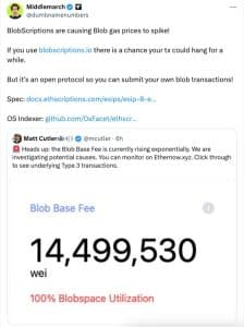 Em uma postagem, o fundador do Ethscriptions, Tom Lehman – que atende pelo pseudônimo de ‘Middlemarch’ – observou o aumento do custo do “blobspace” e pediu aos usuários que cunhassem BlobScriptions por meio do protocolo oficial de blobscription.