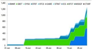 Um relatório recente do Standard Chartered destaca essa tendência, observando que as empresas de tesouraria corporativas de Ether vêm acumulando ETH em ritmo acelerado, ultrapassando suas contrapartes focadas em Bitcoin nos últimos meses. O relatório projeta que essas empresas podem eventualmente deter até 10% do fornecimento total de ETH, um aumento de dez vezes em relação às suas posições atuais.