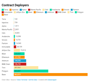 Em termos de implantadores de contrato, que são desenvolvedores criando e testando contratos inteligentes, o Ethereum está apenas em sexto lugar, com 127.702 implantadores de contrato mensais, enquanto o Base está em primeiro lugar, com mais de 862.000 implantadores de contrato, de acordo com dados do Token Terminal.