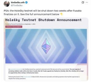 A Ethereum está se preparando para aposentar sua maior rede de testes, a Holesky, como parte de uma transição estratégica para a rede de testes Hoodi. Essa desativação ocorre após uma série de desafios técnicos no início deste ano e coincide com a próxima atualização da rede Fusaka. De acordo com a Fundação Ethereum, a Holešky será desativada duas semanas após a finalização da Fusaka, com a atualização da rede principal prevista para novembro de 2025. A data exata para o fim da Holešky não foi confirmada, mas ocorrerá bem antes da implantação da rede principal da Fusaka.