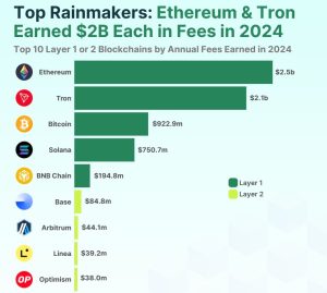 O Ethereum superou todos os outros blockchains na geração de taxas em 2024. Tron ficou em segundo lugar e arrecadou US$2,15 bilhões em taxas – um aumento atraente de 116,7% na taxa de 2023 de US$922 milhões. Bitcoin (BTC) ficou em terceiro, gerando US$922 milhões em taxas, um aumento de 16% em relação ao ano anterior. Os blockchains da camada 1 no total agregaram um total de US$6,60 bilhões. As soluções da camada 2 agregaram pouco mais de US$294 milhões.