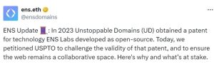 Os membros da comunidade criptográfica expressaram opiniões divergentes quando o Ethereum Name Service (ENS) contestou oficialmente uma patente dos Estados Unidos concedida a Unstoppable Domains (UD) em janeiro de 2023.