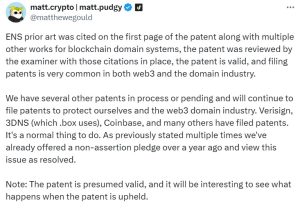 O fundador da Unstoppable Domains, Matthew Gould, respondeu ao ENS no X e disse que o ENS foi citado na patente junto com outros sistemas de domínio blockchain. O fundador da UD disse que a patente foi revisada com essas citações e é válida.