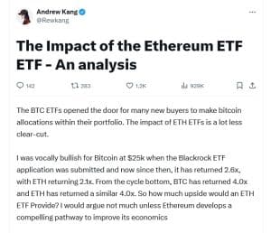 Em uma postagem, Kang disse que, ao contrário do Bitcoin, o Ether atrai menos interesse institucional, há poucos incentivos para converter o Ether à vista em forma de ETF e os fluxos de caixa da rede não têm sido muito impressionantes.