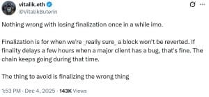 Em uma discussão pública recente, Buterin observou que perder a finalidade de vez em quando não é inerentemente perigoso para a rede. Ele explicou que a finalidade é essencialmente um indicador de alta confiança de que a rede tem certeza de que um bloco não será revertido. Se um bug ou uma queda repentina na atividade dos validadores atrasar essa confirmação por algumas horas, o blockchain simplesmente continua a produzir novos blocos e processar transações normalmente.