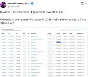 A promessa de um Ethereum mais rápido e eficiente está dando um grande passo adiante à medida que 2025 se aproxima do fim. Durante a última reunião geral de desenvolvedores, em meados de dezembro, os pesquisadores confirmaram um plano estratégico para aumentar o limite de gas da rede de 60 milhões para 80 milhões de unidades em janeiro de 2026.