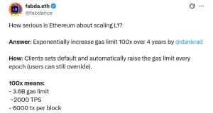 Em um desenvolvimento significativo para a escalabilidade da Ethereum, o pesquisador da Fundação Ethereum, Dankrad Feist, apresentou a Proposta de Melhoria da Ethereum (EIP) 9698. Esta proposta descreve um plano para aumentar o limite de gás da rede principal da Ethereum em um fator de 100 nos próximos quatro anos, com o objetivo de aprimorar a taxa de transferência de transações e a competitividade da rede.