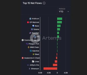 Citando dados da plataforma de dados criptográficos Artemis, Nadeau destacou que no acumulado do ano (YTD), a Solana perdeu cerca de US$55 milhões em TVL para a Base, Optimism e Arbitrum.