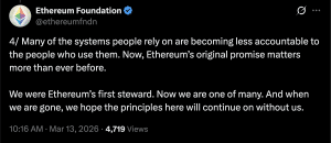 A ETHEREUM FOUNDATION decidiu deixar mais claro qual é, de fato, seu papel dentro do ecossistema. A mensagem central é direta: menos controle, mais autonomia da rede. Em um novo documento oficial, a organização reafirma seus objetivos e estabelece princípios que devem guiar o futuro do Ethereum.