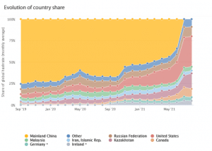 Talvez seja de particular interesse o fato de que os dados do CBECI mostram uma taxa de hash de 0% na China. No entanto, é possível que as operações secretas de mineração ainda estejam em andamento, apesar da proibição.
