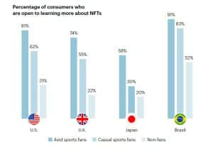 Nos EUA, Reino Unido, Japão e Brasil, 58% dos fãs de esportes acreditam ter algum nível de entendimento sobre NFTs. Além disso, 54%, ou 1.755, dos entrevistados acreditam que os NFTs impactaram positivamente seus esportes favoritos.