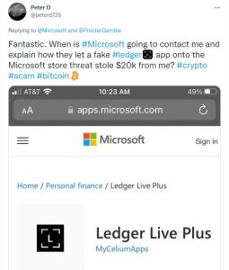 Outro usuário diz que foi vítima de um aplicativo falso de carteira de criptomoedas Ledger Live, supostamente chamado de “Ledger Live Plus”, na loja de aplicativos da Microsoft. O usuário alega que o aplicativo fraudulento já roubou US$20.000 dele.