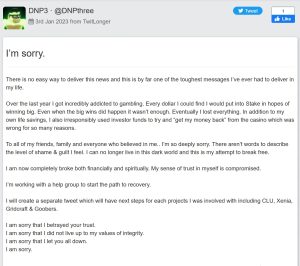 Taylor emitiu um pedido público de desculpas por suas ações em janeiro de 2023, dizendo que se tornou incrivelmente viciado em jogos de azar e acrescentou que estava profundamente arrependido por usar indevidamente os fundos dos investidores.