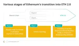 A jornada de transição do Ethereum para o ETH 2.0 baseado em PoS começou em 1º de dezembro de 2020, com o lançamento do Beacon Chain, iniciando a Fase 0 da transição. A fase 1 do programa estava programada para ser lançada em meados de 2021, mas foi adiada para o primeiro trimestre de 2022 devido ao trabalho inacabado e às complexidades envolvidas na auditoria do código.