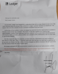 Envolvido em uma embalagem aparentemente autêntica, o dispositivo, no entanto, incluía vários sinais reveladores que despertaram a suspeita do colaborador. Mais chocantemente, o pacote veio junto com uma carta mal escrita alegando ter sido assinada pelo CEO da Ledger, Pascal Gauthier, dizendo ao seu destinatário: