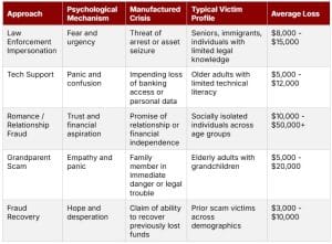 Entre as principais estratégias utilizadas pelos criminosos, destacam-se cinco categorias: falsos representantes do governo, fraudes de suporte técnico, golpes do “avô”, ofertas falsas de recuperação de valores e os esquemas conhecidos como pig butchering — nos quais vítimas são manipuladas emocionalmente antes de serem exploradas financeiramente.