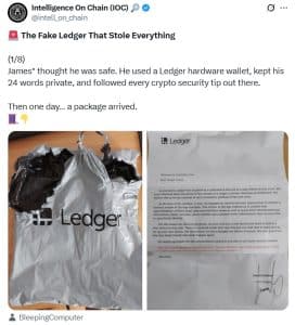 Outro golpe comum envolve carteiras de hardware adulteradas. Carteiras frias falsas são enviadas como “prêmios de loteria grátis” ou anunciadas como atualizações de segurança, mas são fraudadas desde o início. Usuários de criptomoedas no TikTok foram vítimas: um investidor perdeu impressionantes US$6,5 milhões após usar uma carteira criada com um backdoor.