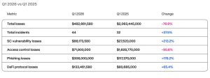 O universo Web3 registrou perdas de US$ 482 milhões no primeiro trimestre de 2026, revelando uma mudança relevante no perfil dos ataques. O problema não está mais apenas no código, mas nas pessoas e processos. Dados da HACKEN mostram que, embora o número total de incidentes tenha sido relativamente contido, com 44 casos, a natureza das falhas evoluiu para áreas menos visíveis da segurança.