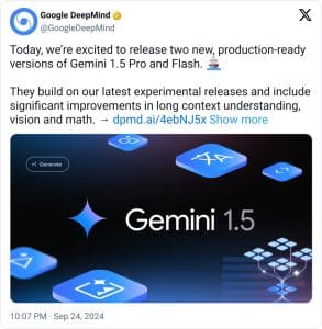 O Google anunciou o lançamento de versões estáveis do Gemini 1.5 Pro (gemini-1.5-pro-002) e Gemini 1.5 Flash (gemini-1.5-flash-002). Comparados com os modelos 001 anteriores, os novos modelos Gemini prontos para produção exibiram melhorias significativas na geração de código, matemática, raciocínio e análise de vídeo.