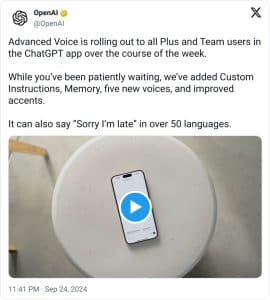 Enquanto isso, o maior concorrente de inteligência artificial do Google, OpenAI, começou a lançar seu recurso “Advanced Voice” para usuários selecionados do ChatGPT.