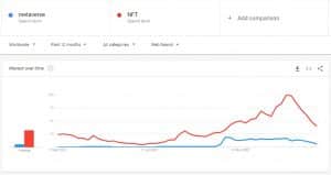 Além da palavra-chave “metaverso”, os dados mostram que a busca mundial por “NFTs” também começou seu declínio este ano. No entanto, a queda do NFT é mais perceptível, pois atingiu recordes em 2021 e caiu acentuadamente no primeiro trimestre de 2022.