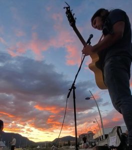 (Tomy tocando ao pôr do sol com o sinal em vista. Fonte: Tomy)