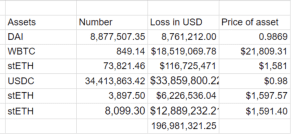 O hacker realizou várias transações, roubando quase US$196 milhões do protocolo em um ataque de empréstimo instantâneo apelidado de o maior hack DeFi de 2023. Os ativos roubados incluem 8,8 milhões de Dai (DAI), 849.000 Bitcoin embrulhado (WBTC), 85 milhões de Stake Ether (stETH) e 34 milhões de USD Coin (USDC).