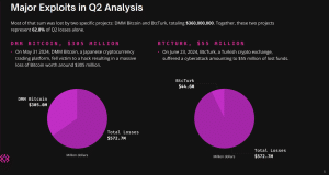 A maior perda individual no segundo trimestre foi causada pelo hack da chave privada da exchange de criptomoedas DMM, que drenou US$305 milhões em Bitcoin (BTC).