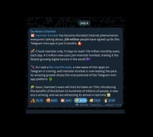 Em uma postagem pública para os 2,7 milhões de assinantes de seu canal Telegram, Durov destacou o sucesso crescente do jogo clicker viral. Desde o seu lançamento em março de 2024, o jogo atraiu mais de 200 milhões de jogadores.