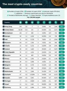 Fatores como instalações de caixas eletrônicos criptográficos, regulamentos pró-criptomoedas, cultura de startups e um regime tributário justo sinalizam a prontidão de um país para adotar criptomoedas. Considerando esses fatores, um estudo do Forex Suggest revelou a posição de Hong Kong como o país mais bem preparado para a adoção generalizada de criptomoedas, com uma pontuação de prontidão de criptomoeda de 8,6. Apesar de ter uma infraestrutura maior do que a nação insular, os Estados Unidos e a Suíça chegaram aos três primeiros com pontuações mais baixas de prontidão para criptomoedas de 7,7 e 7,5, respectivamente, conforme mostrado abaixo.