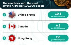 Os dados do CoinATMRadar mostram que os EUA abrigam 88% das instalações globais de caixas eletrônicos de ativos. Pelo contrário, Hong Kong instalou uma rede de 146 caixas eletrônicos criptográficos, representando apenas 0,4% dos caixas eletrônicos criptográficos em todo o mundo. Devido à área menor, os residentes de Hong Kong nunca estão a mais de 7 quilômetros de distância de um caixa eletrônico de criptomoedas.