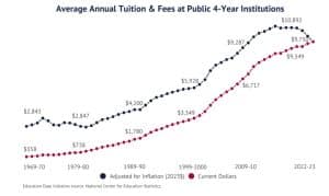 De acordo com a Education Data Initiative, as mensalidades e taxas relacionadas têm superado consistentemente a inflação em muitos países, levando ao aumento da dívida estudantil e à redução do acesso ao ensino superior para populações de baixa renda.