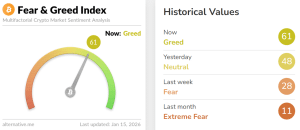 A psicologia do mercado está demonstrando sua resiliência, à medida que o espaço de ativos digitais finalmente se livra das sombras de um inverno brutal. Pela primeira vez desde a devastadora crise de liquidez de outubro, o Índice de Medo e Ganância das Criptomoedas (Crypto Fear and Greed Index) voltou a apresentar sinais de ganância. Essa mudança marca uma virada significativa para um mercado que passou meses preso em um ciclo de pânico e extrema cautela. A súbita ascensão para uma pontuação de 61 sugere que os investidores estão finalmente recuperando seu apetite por risco.