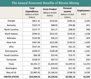 Além da criação de empregos, a indústria de mineração de Bitcoin tem um impacto considerável na economia dos EUA, contribuindo com mais de US$4,1 bilhões para o produto interno bruto (PIB) anualmente. Este número ilustra a crescente importância da indústria no cenário econômico mais amplo.