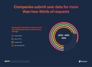 Meta, Microsoft, Apple e Google foram as quatro grandes empresas de tecnologia incluídas durante a pesquisa, com a Meta tendo o maior número de contas de interesse das autoridades. Duas das cinco contas hospedadas pela Meta foram solicitadas (6,6 milhões) durante o período do estudo.