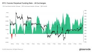 Os dados mais recentes da GLASSNODE revelam um aumento significativo na alavancagem. O interesse em aberto de contratos perpétuos — o valor total dos contratos futuros em aberto que não expiram — subiu para 310.000 BTC, à medida que os traders se posicionavam para uma possível alta. Esse aumento foi acompanhado por uma alta na taxa de financiamento, que subiu de 0,04% para 0,09%. No mundo dos contratos perpétuos, uma taxa de financiamento crescente indica que os detentores de posições compradas estão pagando um prêmio aos vendedores a descoberto para manter suas apostas ativas, um sinal clássico de otimismo. No entanto, também serve como um alerta de um mercado “superaquecido”, onde uma queda repentina de preço poderia desencadear uma onda de liquidações entre compradores com alavancagem excessiva. O interesse em aberto de contratos perpétuos subiu para 310.000 BTC, sinalizando um mercado possivelmente superaquecido e vulnerável a liquidações.