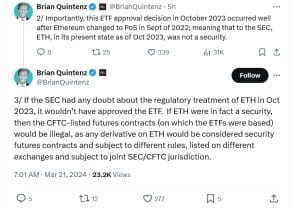 Brian Quintenz, ex-comissário da Commodity Futures Trading Commission, também argumentou que a SEC já havia reconhecido explicitamente o status de não-segurança do Ether em outubro passado, quando aprovou os ETFs de futuros do Ether.