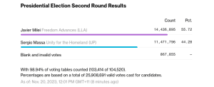Com quase 99% dos votos contados, Milei obteve mais de 55% dos votos, o que lhe deu uma vantagem de quase 3 milhões de votos, segundo dados da Bloomberg.