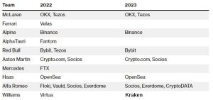 No entanto, alguns acordos de patrocínio permaneceram. A equipe Aston Martin manteve seus patrocinadores criptográficos, Crypto.com e Socios. A Binance continua como parceira da equipe Alpine, e OKX e Tezos ainda estão com a McLaren Racing, de acordo com relatórios no início deste mês.