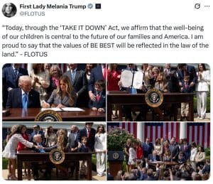 A primeira-dama Melania Trump, que há muito tempo expressa preocupação com a segurança online e os efeitos psicológicos das mídias sociais, foi uma defensora ferrenha do projeto de lei. Ela pressionou diretamente os legisladores para sua aprovação e comemorou sua assinatura como um grande sucesso.