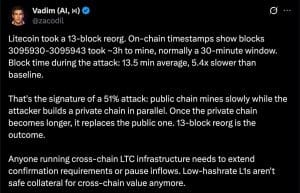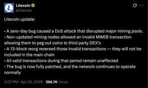 A Litecoin informou que sua blockchain foi atingida no sábado por uma vulnerabilidade que resultou em reorganização de 13 blocos da rede. Segundo a equipe do projeto, o incidente envolveu uma falha de “zero-day”, termo usado quando uma exploração ainda não era conhecida publicamente pelos desenvolvedores no momento do ataque. Mesmo redes veteranas continuam expostas a falhas inesperadas. O caso gerou reação imediata entre programadores do setor, alguns deles contestando a versão oficial.