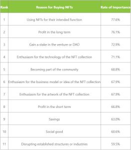 O potencial de lucros a longo prazo apareceu como o segundo fator mais importante, com pouco mais de 76% dos entrevistados dando importância à venda de seus NFTs a um preço mais alto posteriormente.
