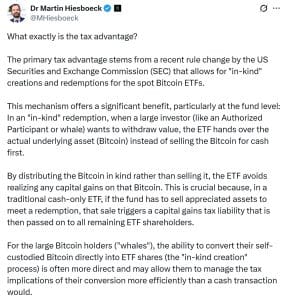 No modelo em espécie, o evento tributável é completamente evitado no nível do fundo. Quando um participante autorizado deseja resgatar suas ações do ETF, o gestor não vende Bitcoin. Em vez disso, transfere o valor equivalente em Bitcoin real diretamente ao participante. Essa transferência não é uma venda tributável, evitando o problema que assolava investidores de longo prazo. Como explicou Martin Hiesboeck, da UPHOLD — que foi o primeiro a chamar atenção para essa tendência — esse mecanismo protege todos os investidores que mantêm seus investimentos no ETF das consequências fiscais dos resgates de terceiros. Para um grande investidor com ganhos de milhões de dólares, a capacidade de transferir Bitcoin de autocustódia diretamente para essa estrutura com eficiência tributária, ao mesmo tempo em que obtém conveniência e legitimidade de um produto financeiro tradicional, tornou-se irresistível. A filosofia de “se não são suas chaves, não são suas moedas” parece estar lutando para competir com os incentivos poderosos do diferimento de impostos e da conveniência oferecida por WALL STREET.